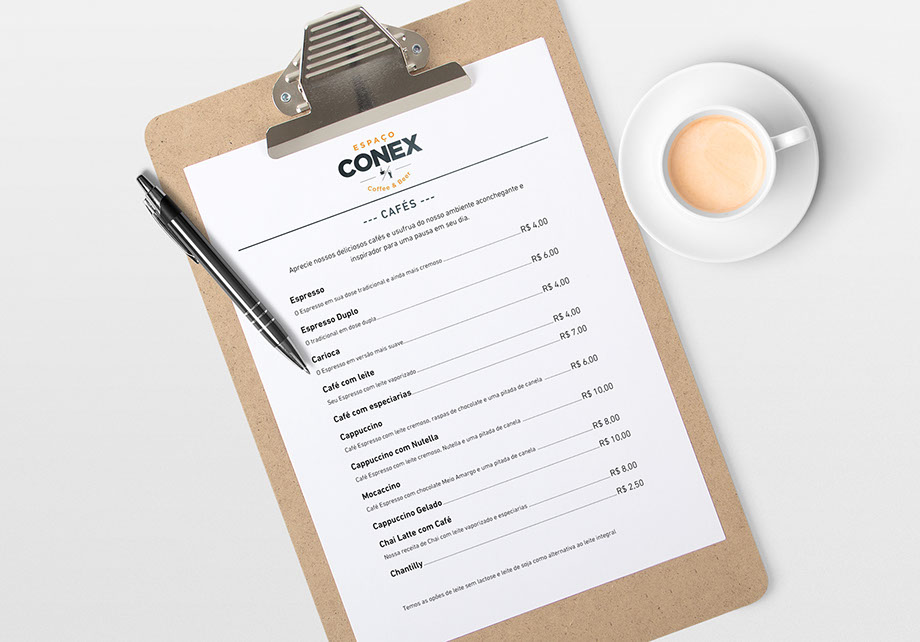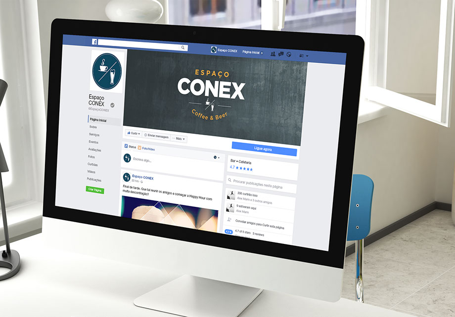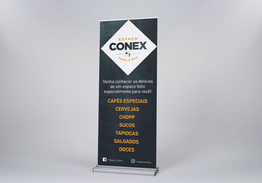 Após uma pesquisa e brainstorm, optou-se pela proposta inicial e o nome escolhido foi Espaço Conex – Coffee & Beer. Durante o projeto o nome se mostrou ser uma escolha mais do que acertada, pois se encaixou como uma luva no estilo hipster proposto para a identidade visual.