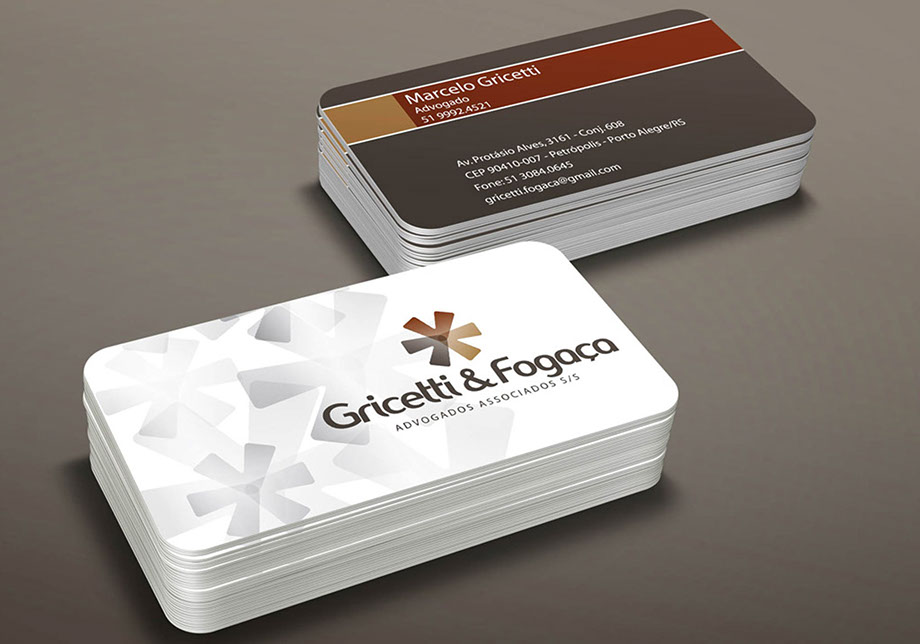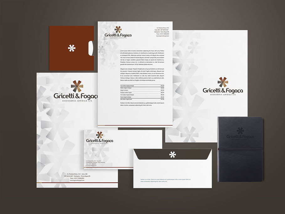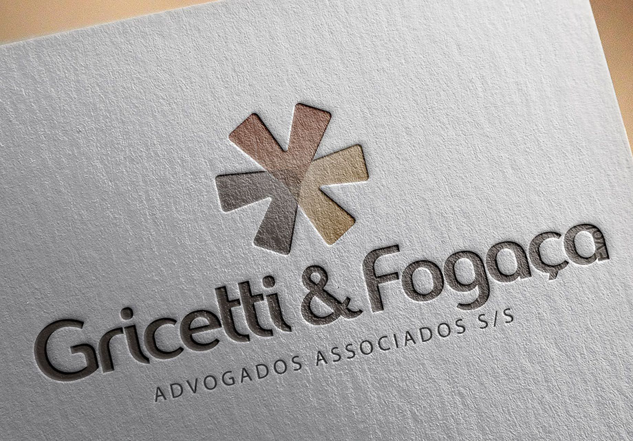 Para desenvolver a logotipia do escritório de advocacia Gricetti & Fogaça parti da percepção da grande maioria das pessoas de que o Direito se divide em 3 grandes áreas: Criminal, Cível e Empresarial. Cada área é representada por uma seta e as 3 setas convergem para o mesmo ponto, ilustrando que o escritório atua de forma abrangente. Além da representação das 3 áreas o símbolo é também um asterisco que na escrita é um caractere “coringa”, usado para mostrar que um determinado termo ou frase necessita de uma explicação mais aprofundada e também para a indicação da referência literária em que o texto ou sentença se baseia. Estes conceitos criam um paralelo com a função do advogado onde seus serviços são contratados para se aprofundar e resolver as necessidades de seu cliente, que com seu conhecimento auxilia sobre os melhores caminhos a seguir.